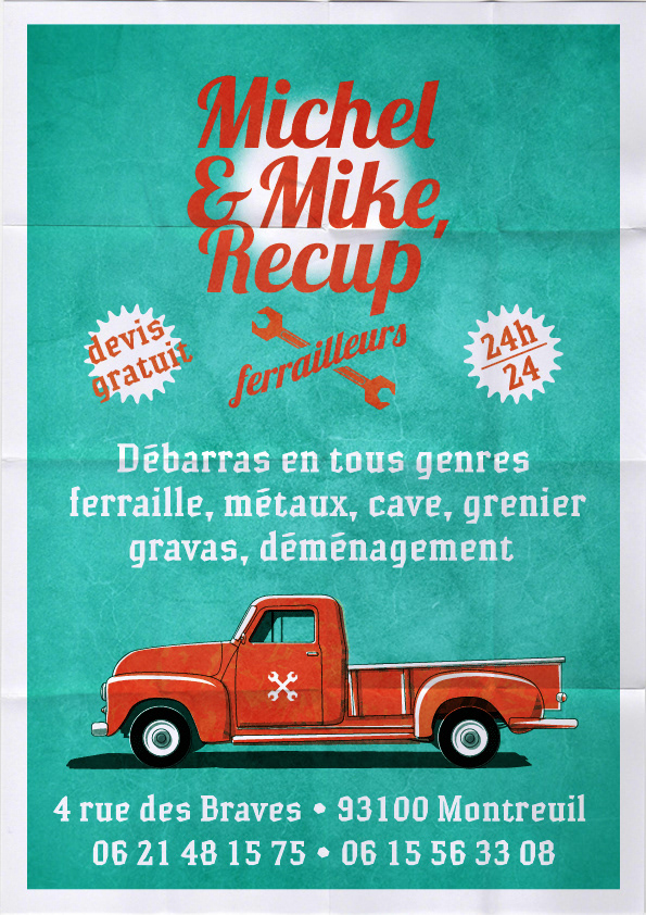 Conception et réalisation de supports de communication (cartes de visite, flyers, affiches...) pour Michel & Mike, ferrailleurs.